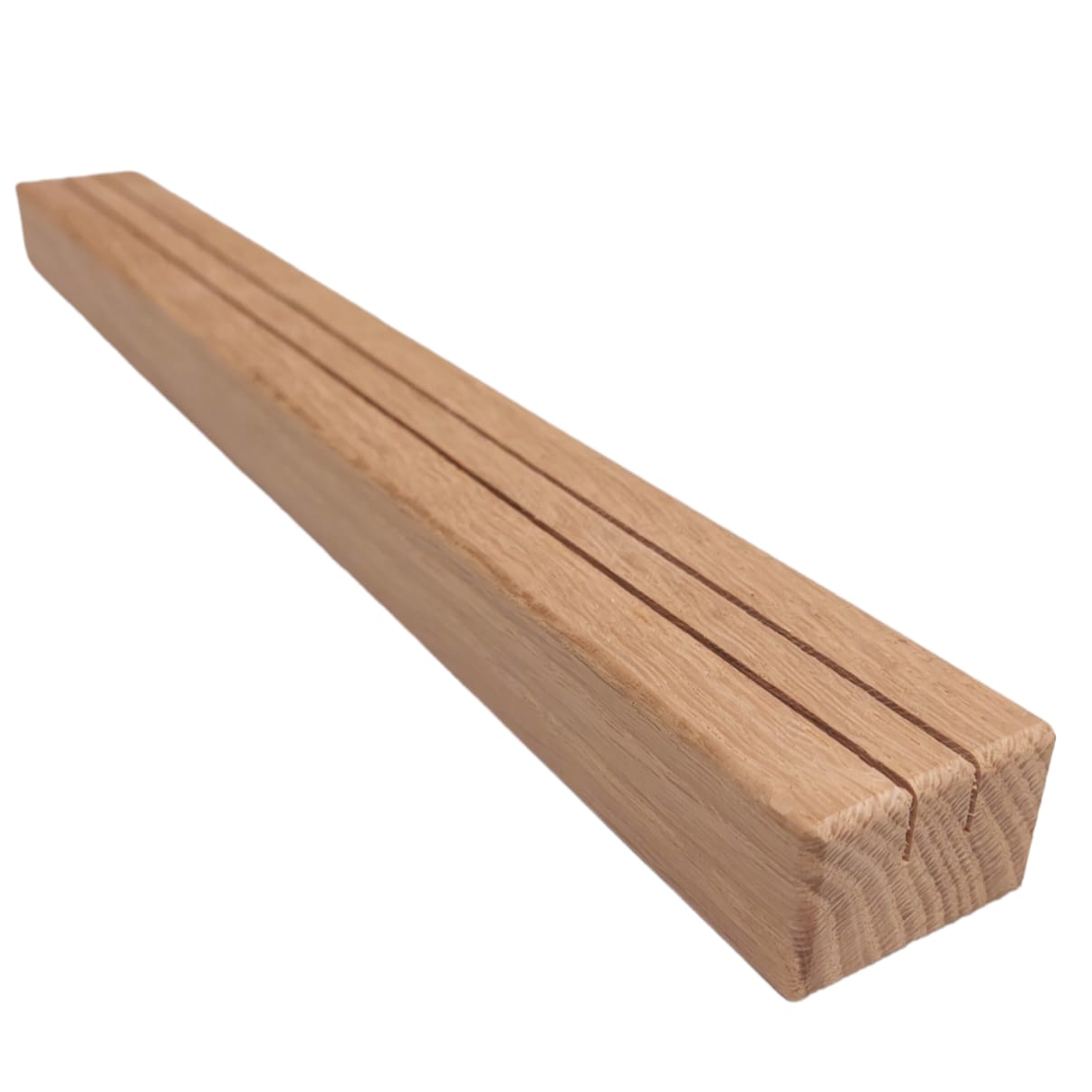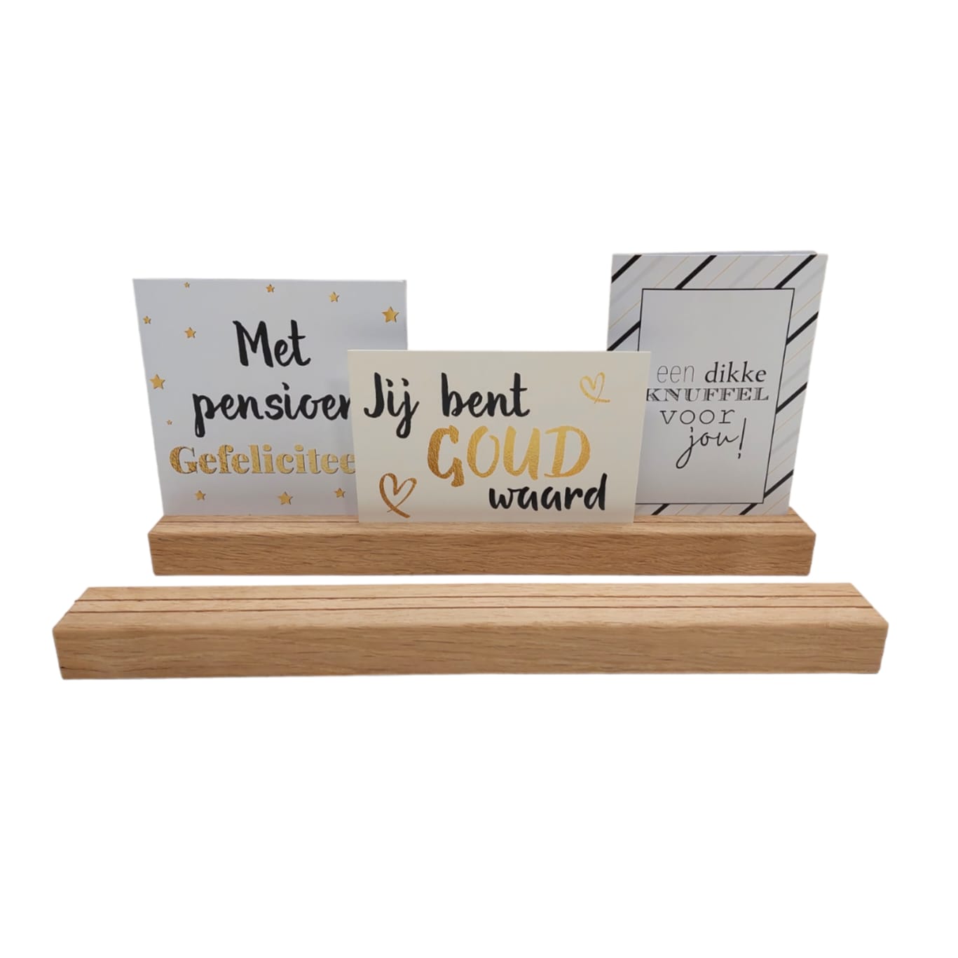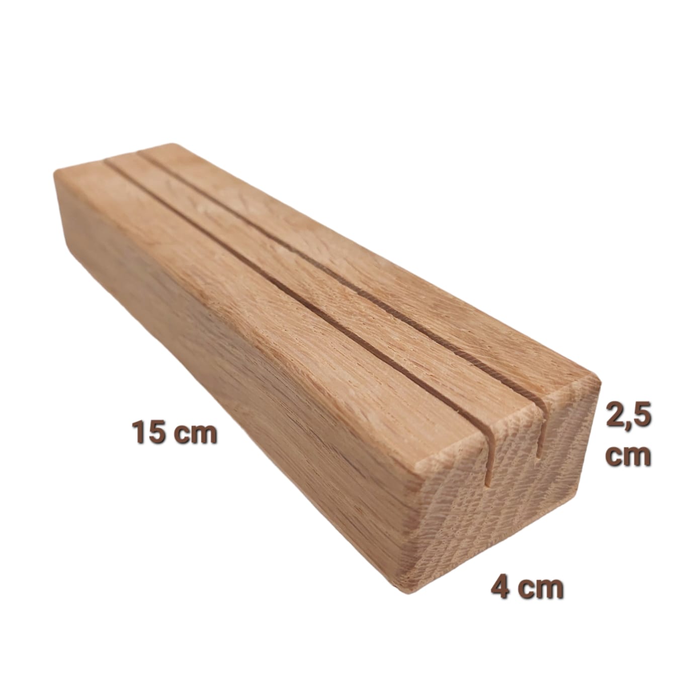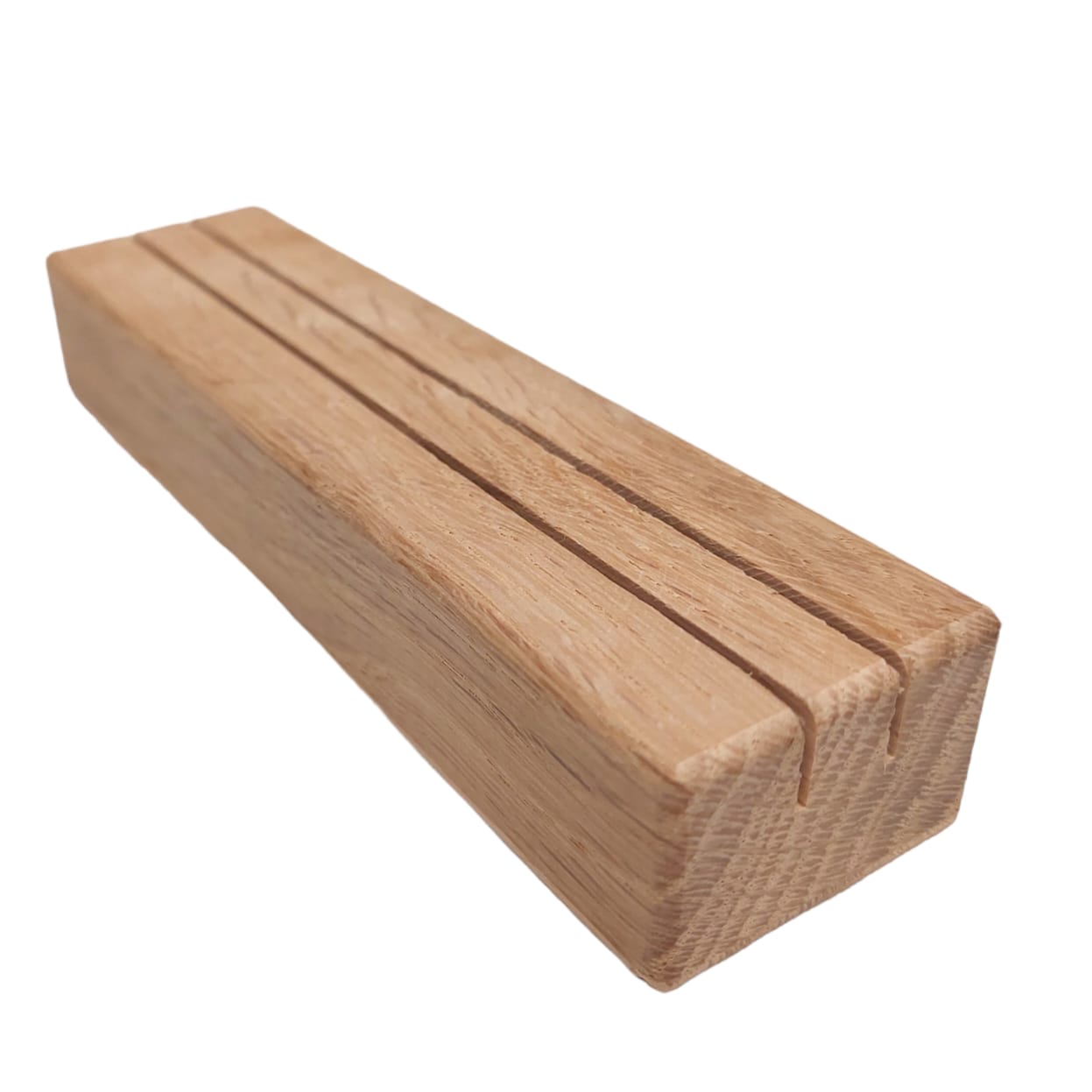 These sturdy wooden cubes with double slots are perfect for presenting cards and photos in an elegant way. They are made from 100% recycled oak wood, making them not only functional but also environmentally friendly. The blocks have a durable quality and ensure that cards remain firmly in place without shifting. They are ideal for displaying photos, postcards, business cards or even menus for tables in the catering industry. With their natural appearance they add a touch of warmth and authenticity to any room. Whether in an office, shop or home, these wooden cubes are a practical and stylish choice for presenting cards.