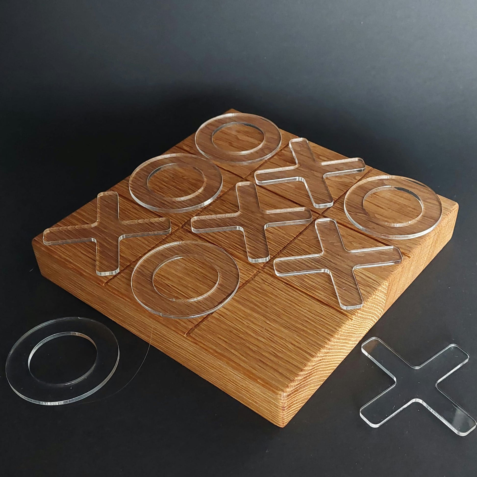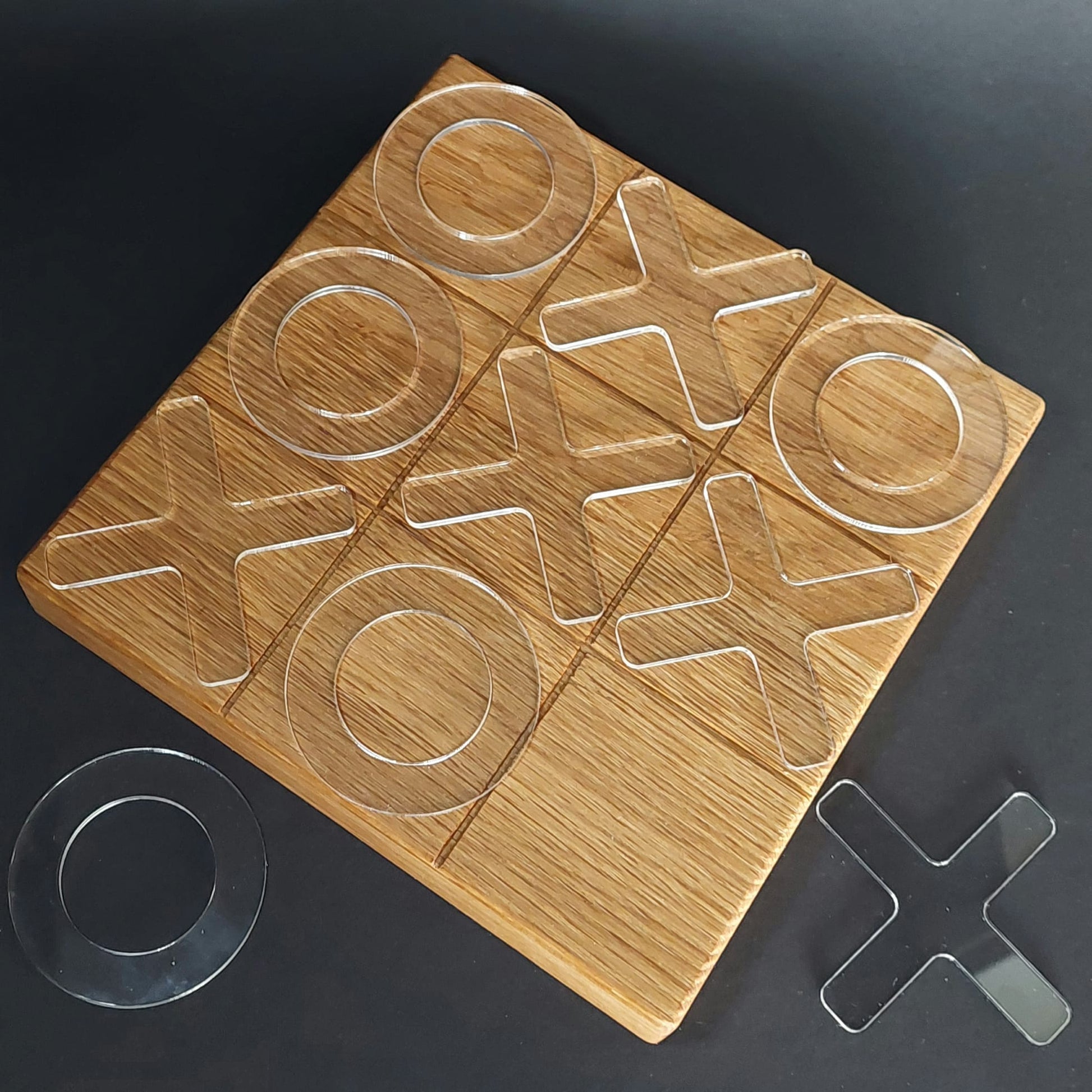 Verrijk je interieur met ons exclusieve "Tic Tac Toe" spel, een tijdloos spel opnieuw vormgegeven als een echt designstuk. Dit prachtige spel is met zorg samengesteld met een groot speelbord van 20 x 20 x 3 cm, vervaardigd uit 100% duurzaam massief eikenhout, dat warmte en natuurlijke schoonheid uitstraalt. De unieke speeltegels, gemaakt van 100% gerecycled doorzichtig kunststof, voegen een moderne twist toe, waardoor het spel niet alleen leuk is om te spelen, maar ook een opvallend object is in elk interieur.